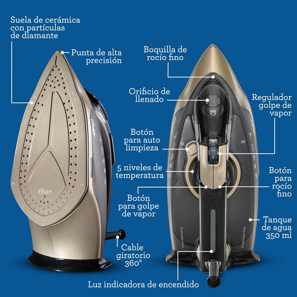 La plancha a vapor de la marca Oster está diseñada para ofrecer una experiencia de planchado superior con características avanzadas que facilitan el cuidado de la ropa. Una de sus funciones destacadas es la capacidad de vapor vertical, que permite eliminar las arrugas de prendas colgadas, cortinas y otras telas sin necesidad de una tabla de planchar. Esta función es ideal para retoques rápidos y prendas delicadas.